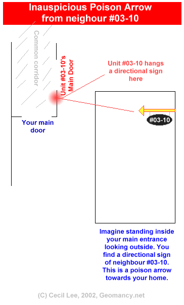 Please refer to the attached illustration file. In this file you can notice that from inside the house, one can see a neighbour's directional sign (with an arrowhead) slicing thru the main door. This is indeed a threat to my client's house.